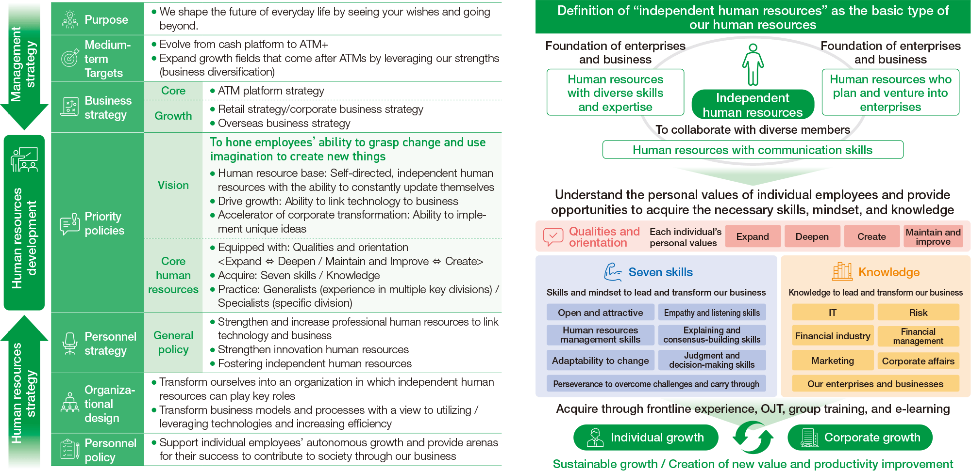 Seven Bank’s human capital management aims to support the autonomous growth of “employees” who are to drive corporate value enhancement and provide them with arenas for success. This will enable all employees to contribute to society through business undertakings with a mindset geared to innovation, toward achieving the “future of everyday life” set forth in our Purpose. Regarding employees who are the driving force of human capital management, the Bank has declared “independent human resources” to be the ideal employees it seeks. Having clarified the definition of such human resources, it has set forth that providing opportunities for employees to acquire the necessary skills, mindset, and knowledge as a priority policy for its human resources development.