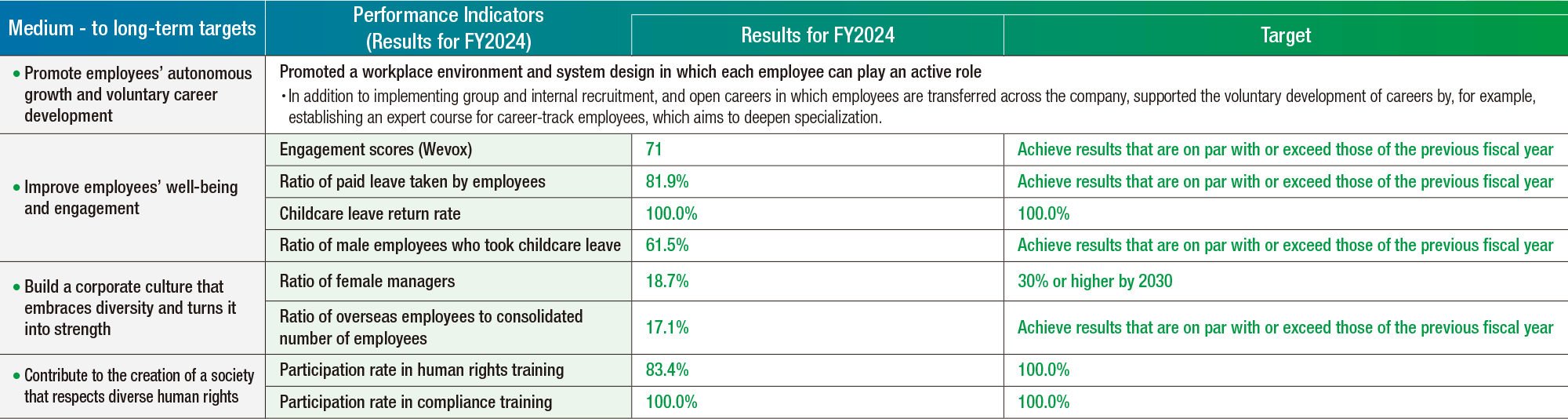 We support individual employees’ autonomous growth and provide arenas for their success to contribute to society through our business