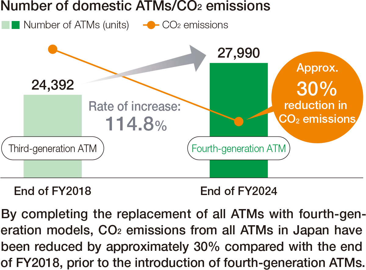 By completing the replacement of all ATMs with fourth-generation ATMs in FY2024, the number of units in Japan has increased by about 15% compared with the time prior to the introduction of fourth-generation ATMs, while we have reduced CO2 emissions by around 30% during that same time.