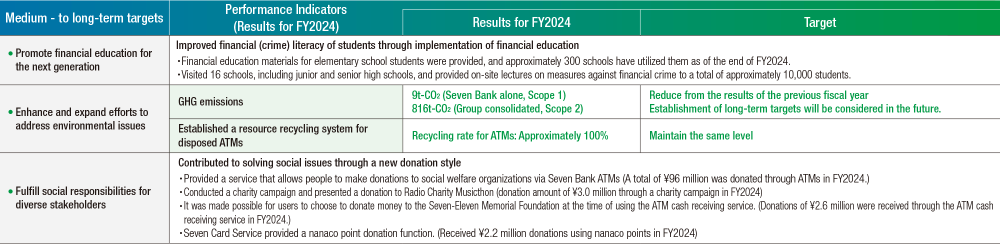 The Seven Bank Group has set to “contribute to the prosperity of our society and the future of the Earth” as one of its five material issues, and considers responses to climate change to be one of its most important management issues. The Seven Bank Group expressed an endorsement of the Task Force on Climate-related Financial Disclosures (TCFD) in 2021. In 2023, we conducted a scenario analysis to measure the impact of climate change on our business activities and revenues in the ATM platform business, which is our core business, which identified risks and opportunities from climate change and estimated the financial impact. Responding to the potential impact of climate change risks and opportunities and taking specific measures, the entire Group will take various initiatives aimed at realizing a decarbonized society.