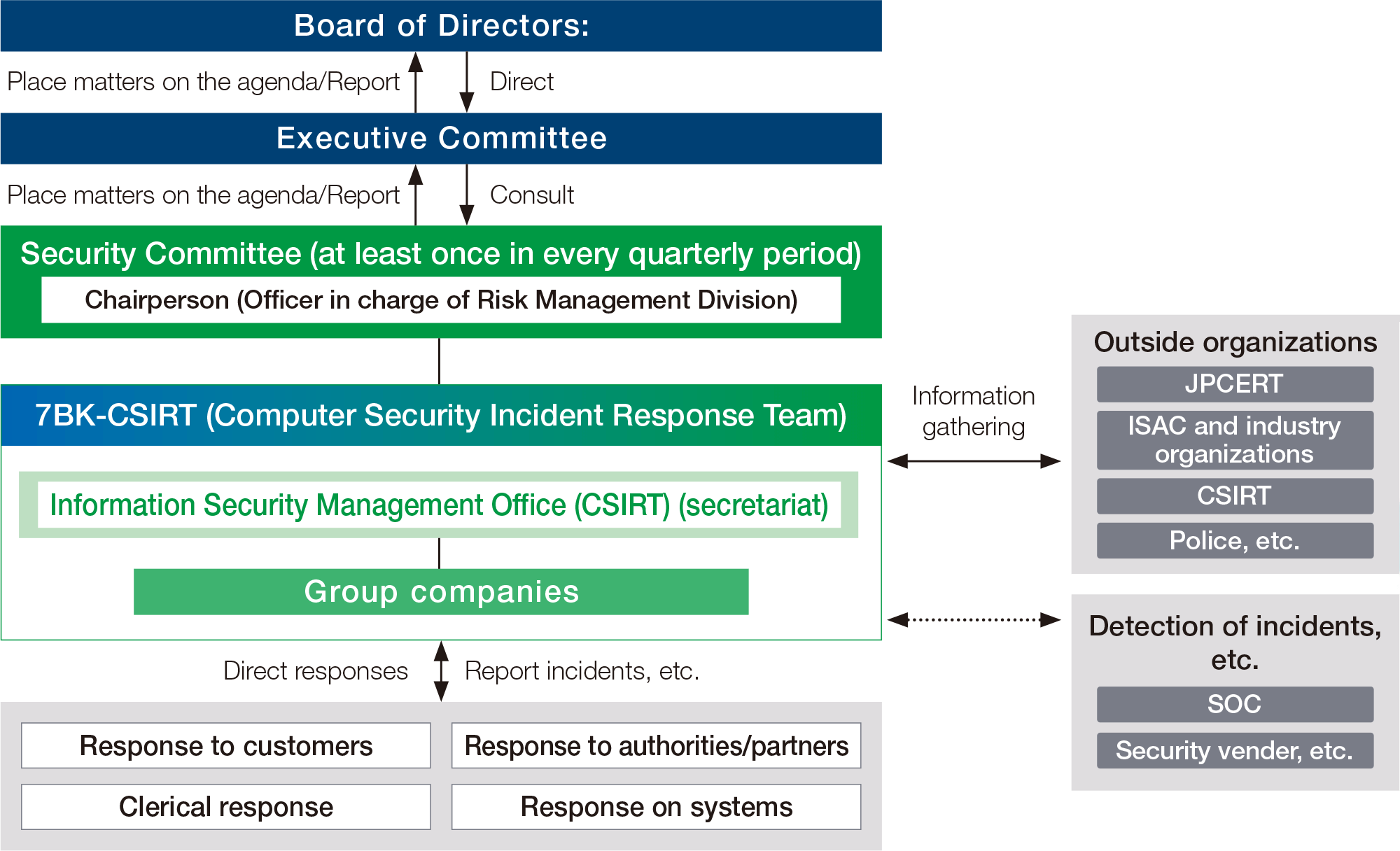 7BK-CSIRT (Computer Security Incident response Team), a dedicated team for cyber security management of the Seven Bank Group, is in charge of the Bankwide management of cyber security risks and is composed of members from multiple divisions. The team responds to a wide range of attacks on the Bank’s services and systems, including cyber attacks, skimming, fake cards, fraudulent access, and information leakage.