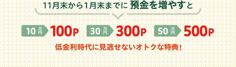| キャンペーン内容 | 開始基準時点と、終了基準時点の預金残高(普通預金+定期預金をあわせて)を比較して、増加額に応じてnanacoポイントをプレゼント。 2017年12月以降に口座開設した方も、2017年11月末の残高を0円として判定しますので、対象となります。 <預金増加額> 10万円以上~30万円未満 30万円以上~50万円未満 50万円以上 → → → <ポイント数> 100P 300P 500P |