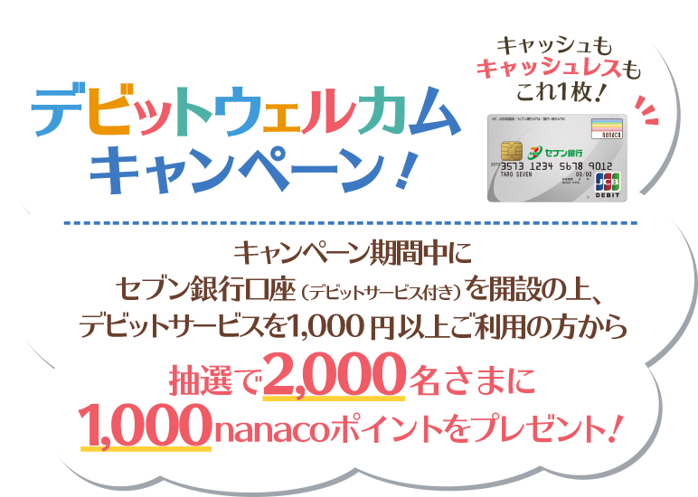 キャンペーン期間中に、セブン銀行口座(デビットサービス付き)を開設の上、デビットサービスでのお支払いを合計1,000円以上ご利用の方