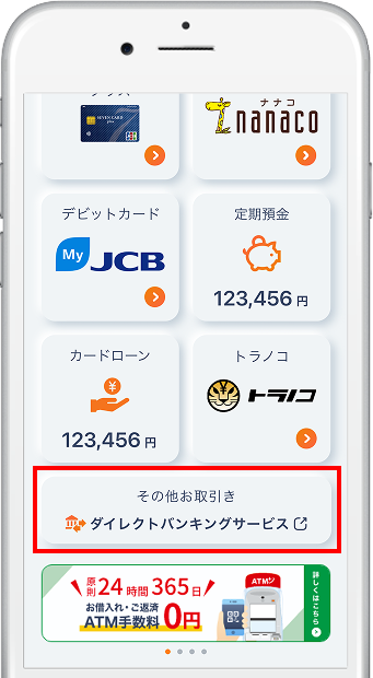 - ※「即時口座開設」で口座開設されたお客さまは、キャッシュカードの到着前に機種変更や本アプリのアンインストールをされると、カード到着前のスマホATMでのお取引きができなくなりますのでご注意ください。