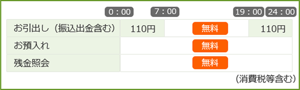 ATM時間外利用があった月の翌月中旬頃、利用回数分の手数料(110円/回)をセブン銀行口座に振込 複数回ご利用があった場合は合算での振込となります。 |
