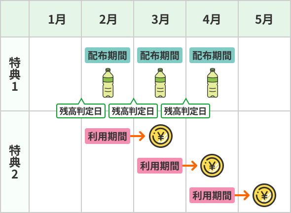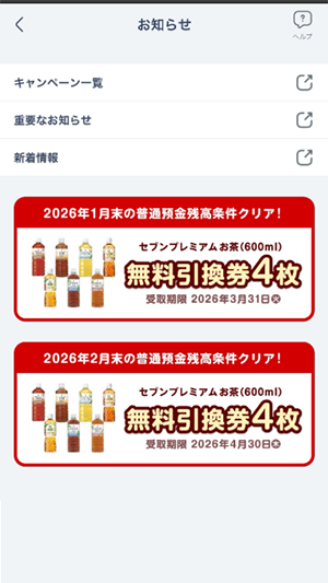 | 特典 | セブンプレミアム お茶 600ml 無料引換券 7種類から1つ(烏龍茶・むぎ茶・ジャスミン茶・ほうじ茶・緑茶・アールグレイ 無糖・ルイボスティー) 各月末時点の普通預金残高が 10万円以上30万円未満:2枚 30万円以上:4枚 |