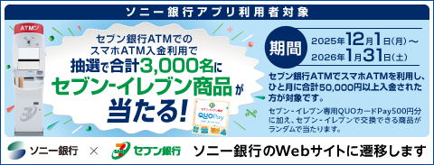 【ソニー銀行アプリ利用者対象】セブン銀行ATMでのスマホATM入金利用で抽選で合計3,000名にセブン‐イレブン商品が当たる!(ソニー銀行(株)のWebサイトに遷移します)