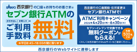 西京銀行の口座開設・住所変更はセブン銀行ATMで!ATMご利用キャンペーン実施中!(西京銀行のWebサイトに遷移します)