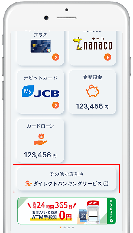 Myセブン銀行(スマートフォンアプリ)ホーム画面下部の「ダイレクトバンキングサービス」ボタンからダイレクトバンキングサービスへログオンしてください。